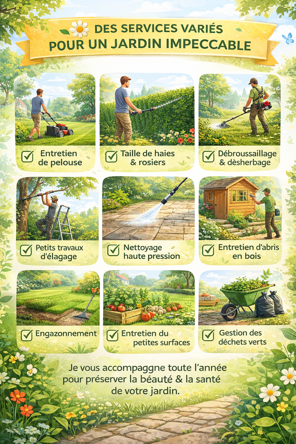 Tonte, taille de haies et d’arbustes, débroussaillage, nettoyage haute pression, entretien de terrasses et abris de jardin, soins aux plantes et au potager… Je propose des prestations variées, réalisées avec du matériel professionnel performant et respectueux de l’environnement.